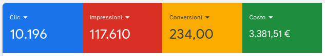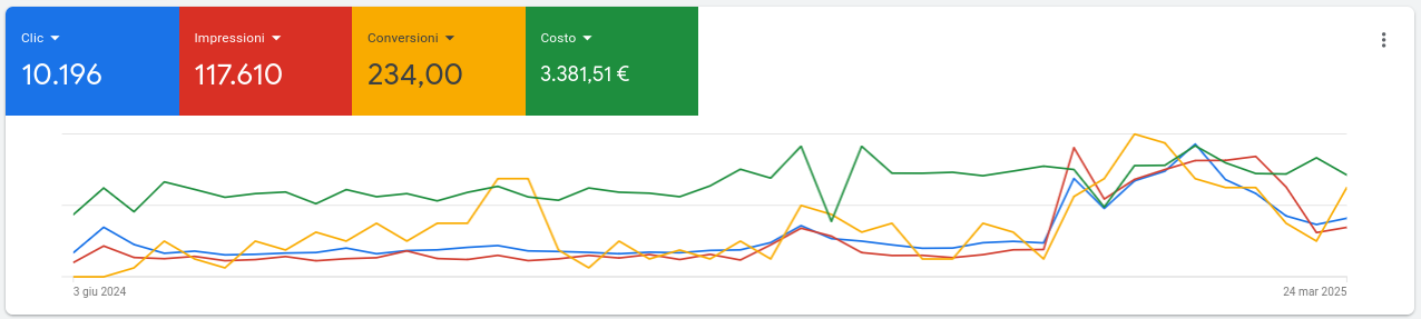 Grazie al bonus Google Ads da 400 €, il totale investito in pubblicità rimane inferiore a 3.000 €.